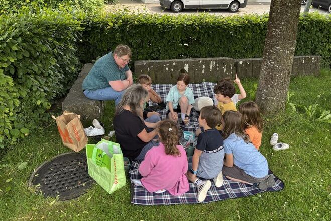 Nach den Entdeckungsreisen trafen sich alle Kinder beim Kindergarten Steinegg zur gemeinsamen Verabschiedung und kehrten anschliessend in ihren eigenen Kindergarten zurück.